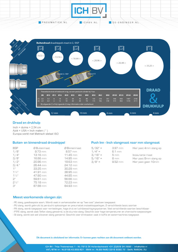 Maten van draadaansluitingen, slangmaten en drukhulp.
